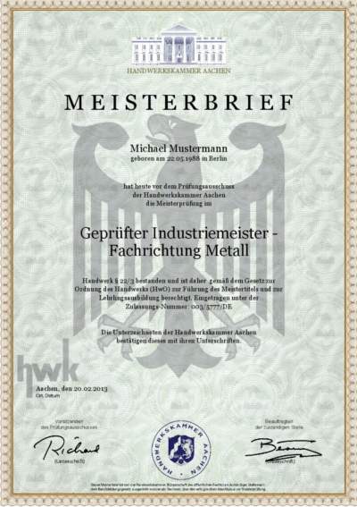 Jeder Meisterbrief ist offiziell anerkannt, in der Datenbank der Handwerkskammer eingetragen und erfüllt die strengen deutschen Qualitäts- und Professionalitätsstandards.